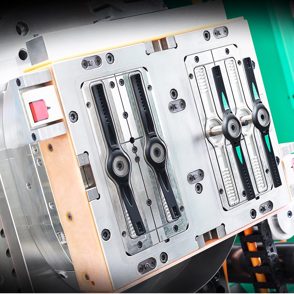 雙色表帶注射成型通過(guò)模具合模后先注射單邊顏色完成注塑成型后,將模芯替換在進(jìn)行二次注射成型達(dá)到雙色效果,同時(shí)達(dá)到完全不分色不分線的效果。