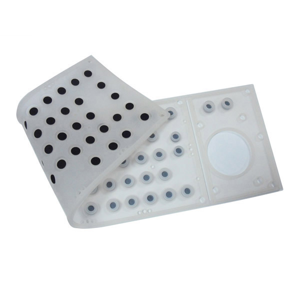 此硅膠鍵盤保護膜有多種款式,這是其中一件。這款硅膠鍵盤的特點是,硬度適中,手感極佳,方便使用;同時易于清洗,抗撕裂。產(chǎn)品表面噴有橡膠油,防塵效果好。