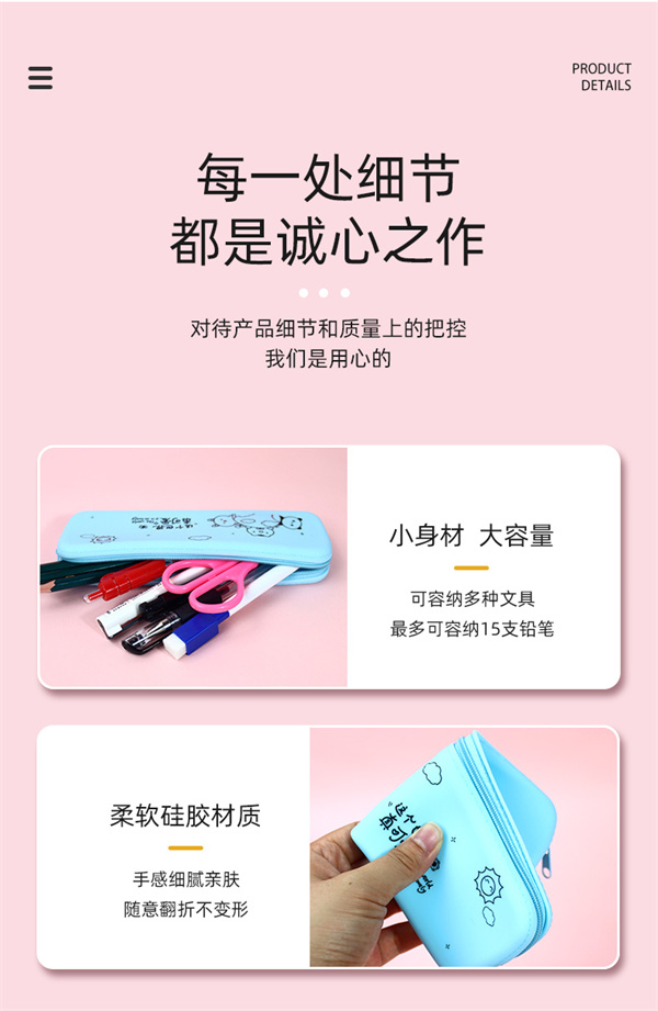 硅膠筆盒采用車縫式拉鏈結構結合成型,產品在使用過程中可以輕松拿取其中的文具用品,優(yōu)質防水耐磨拉鏈可以任意折疊曲折不變形,不斷裂,食品級高拉力氣相膠材質可以長期與筆墨水接觸不產生壽命問題,硅膠筆袋耐磨性良好,可以防止使用時導致摔落和摩擦,清洗方便,可防摔耐磨,任意按壓不易變形。