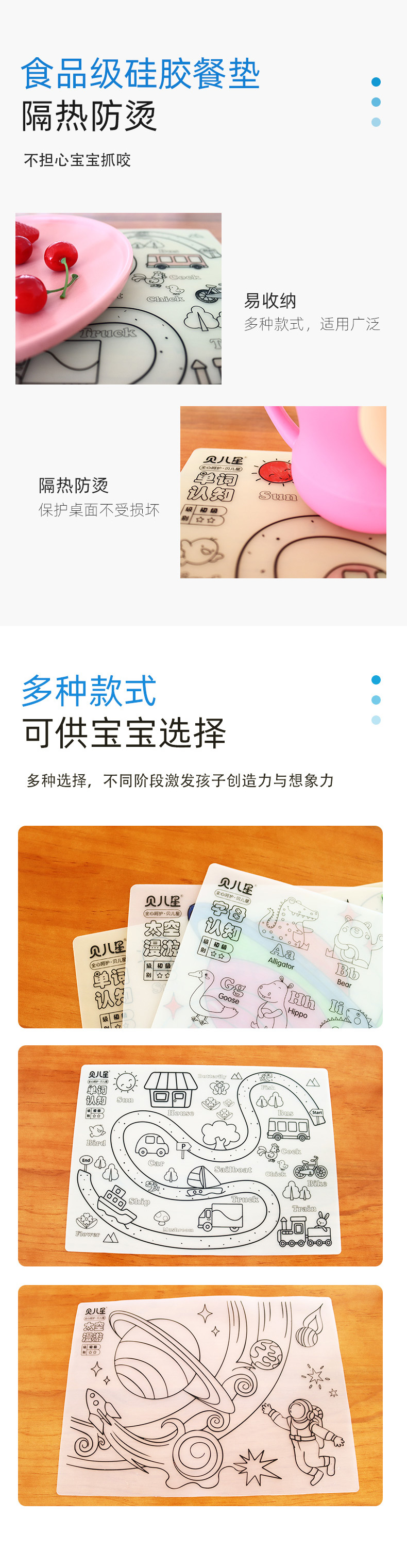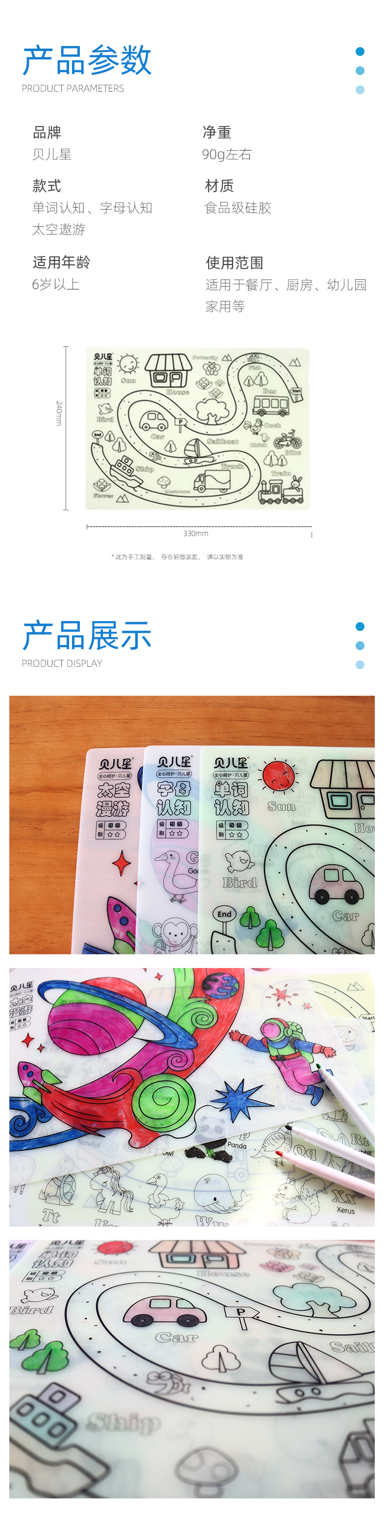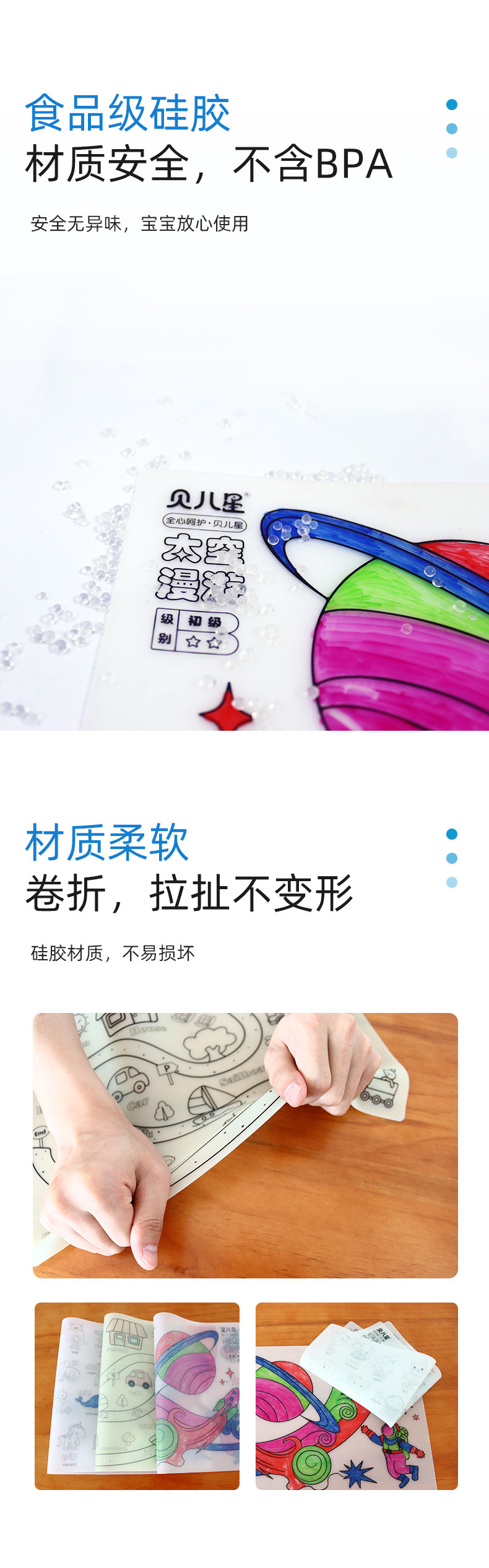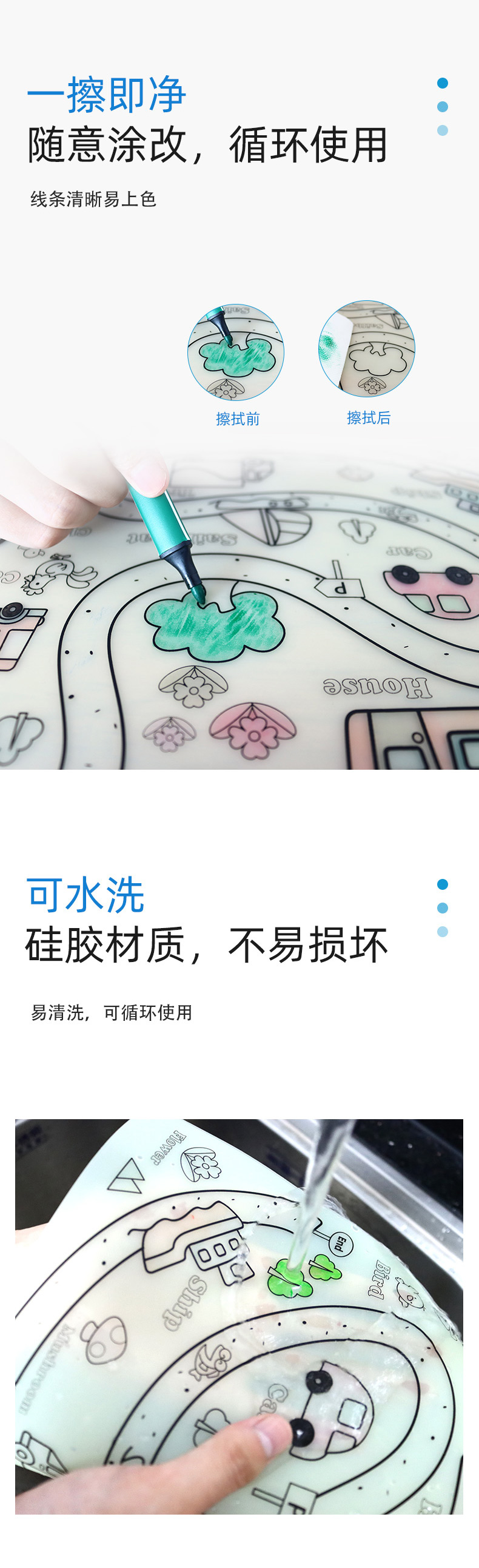 硅膠涂鴉畫板產(chǎn)品的主要買點(diǎn)源于產(chǎn)品的表面圖案以及配套的創(chuàng)意,產(chǎn)品從6-12歲之間具有不同的主題與認(rèn)知圖案,可以連接整體進(jìn)行學(xué)習(xí)提升大腦開發(fā),加強(qiáng)兒童動手能力以及創(chuàng)新創(chuàng)作能力,此外產(chǎn)品配比水性可清洗彩色筆,不會對硅膠表面產(chǎn)生筆污以及筆畫痕跡,材料屬于柔軟回彈食品級硅膠,所以硅膠店鋪可以任意曲折來回折疊不會變形損壞,此外硅膠墊片可水性可隔熱,可耐高低溫,可以在多個行業(yè)領(lǐng)域當(dāng)中運(yùn)用!